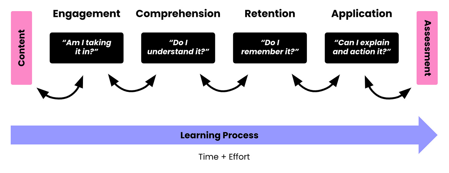 The learning process is less linear and far more complex. There are rarely clearly defined start or end points, and the way we approach education can further obfuscate the nature of the process. However, I think it is possible to plot a path from new information (the course materials) to successful application of that knowledge (some form of assessment). These stages, although abstract, help us understand what must happen for successful learning to take place.
